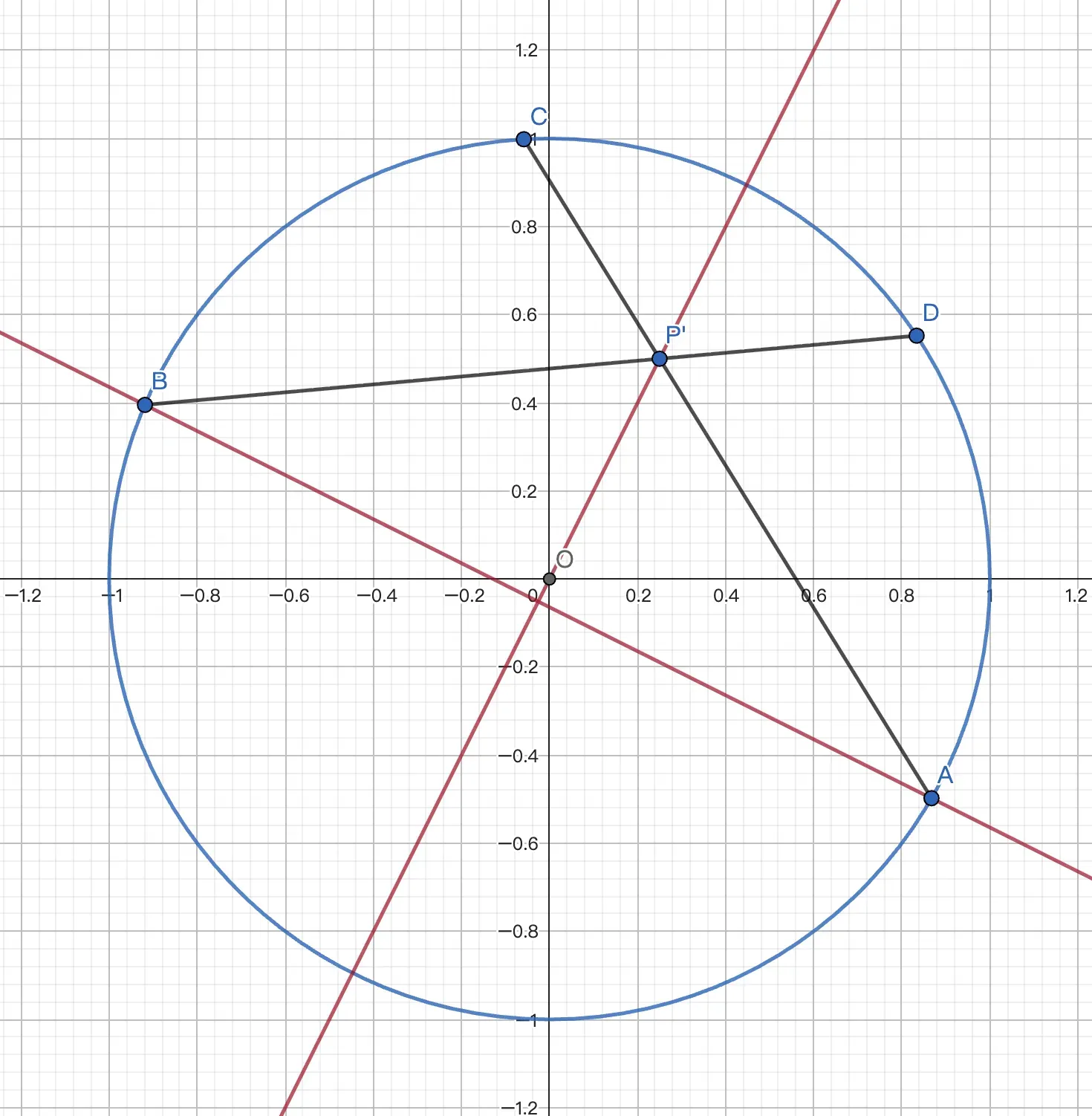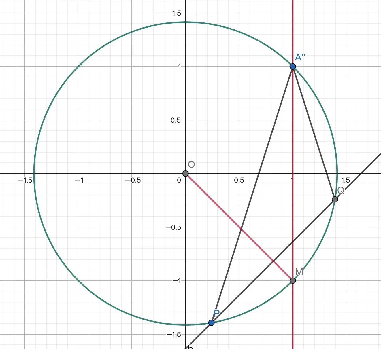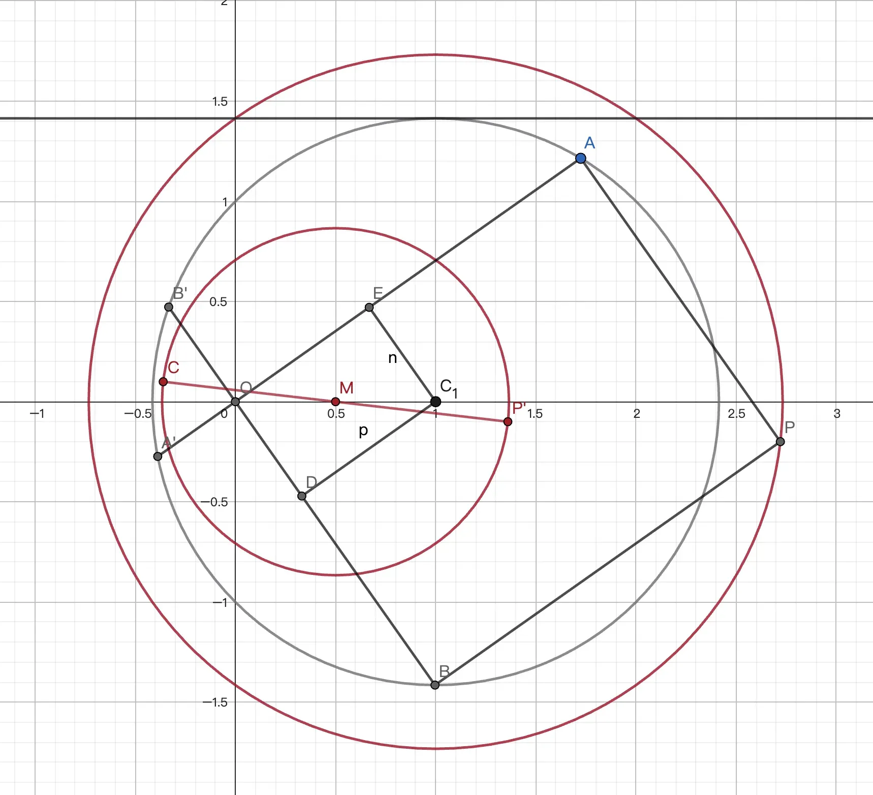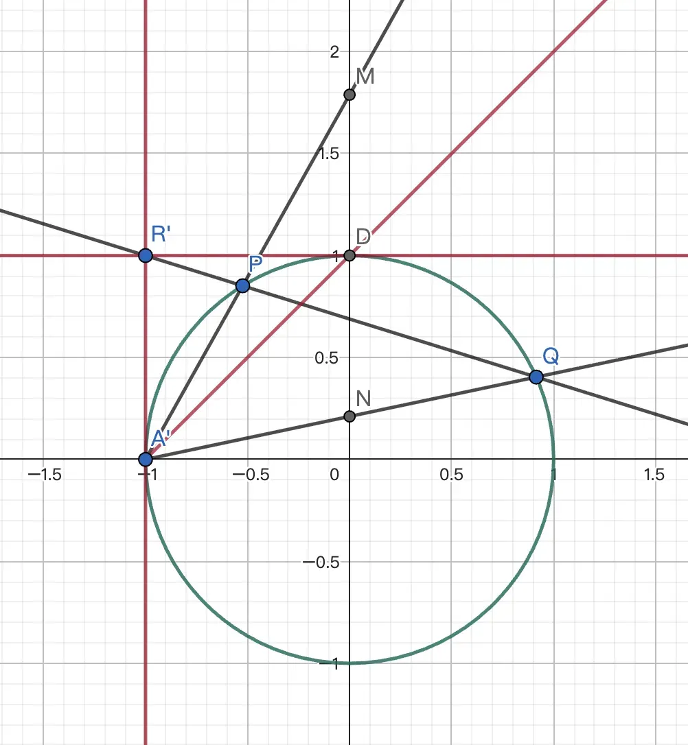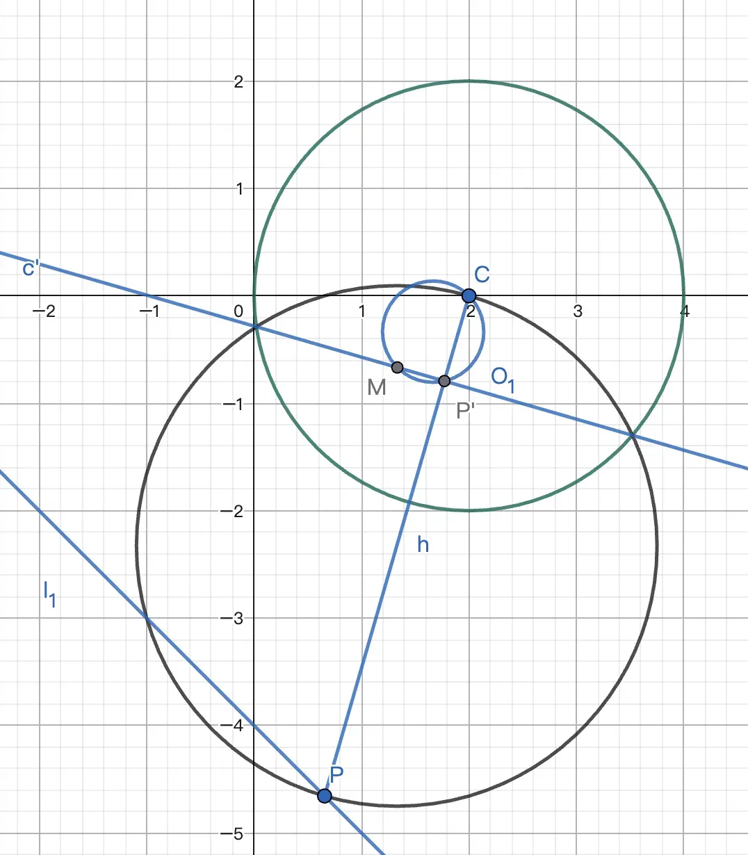 所以 $P'$ 在 $\odot O_1$ 上. $c'\bot CP'$. 显然 $c'$ 过 $C$ 关于 $\odot O_1$ 的对径点 $M$. 故 $\odot O$ 过 $M$ 的反点.易得 $CM:y=x-2$,联立得 $M'(-1,-3)$.