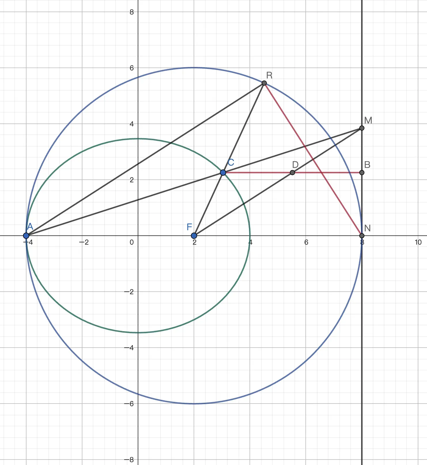 作仿射变换 $(x,y)\rarr(\frac{x}2,\frac{y}3)$, 使 得 $C\rarr\odot O:x^2+y^2=1,R\rarr R'(-1,1),A\rarr A'(-1,0)$. 作 $\odot O$ 顶点 $D(0,1)$,显然 $R'D,R'A'$ 是 $\odot O$ 的两条切线,所以四边形 $A'PDQ$ 是调和四边形,$A'R',A'M,A'D,A'N$ 是调和点列. 又 $A'R'\,//\,MN$,故 $D$ 是 $MN$ 中点.