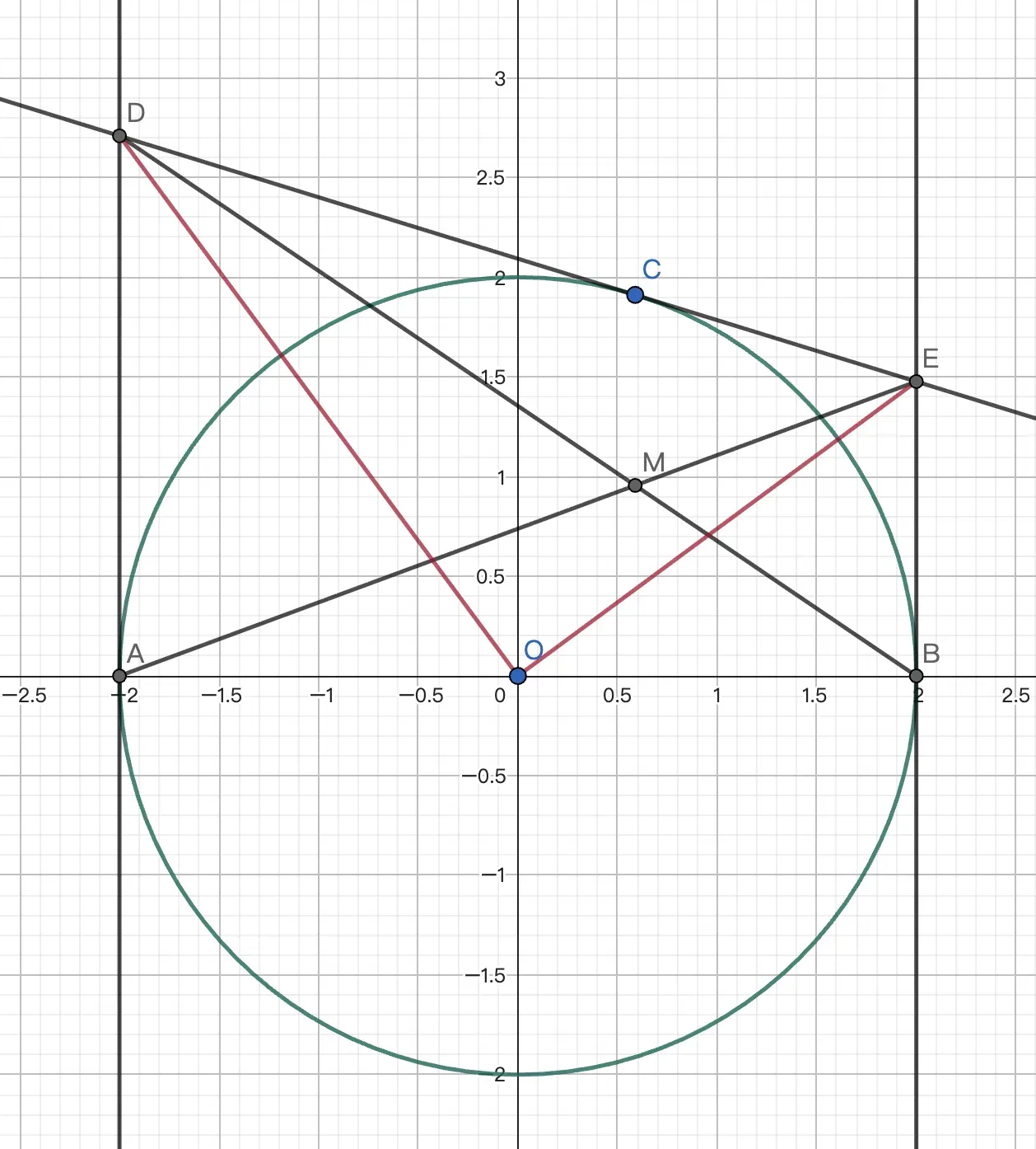 例4 如图,圆 $O:x^2+y^2=4$ 的左右顶点为 $A,B$,过圆上一点 $C$ 作圆的切线交过 $A,B$ 的切线于点 $D,E$. $AE,BD$ 交于点 $M$,求 $M$ 点轨迹.