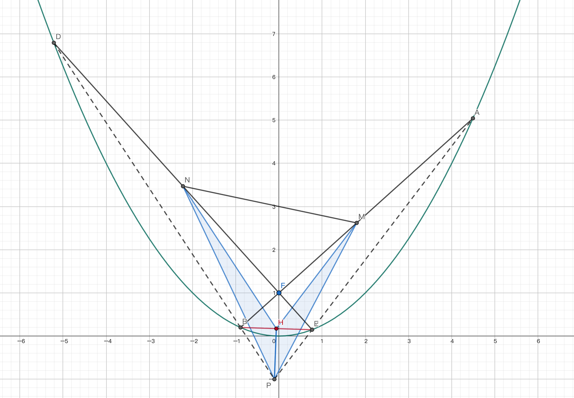 例1 设抛物线 $C:y=\frac{x^2}4$,过点 $F(0,1)$ 作两条互相垂直的直线分别交抛物线于 $A,B$ 和 $D,E$,且 $A,E$ 在 $y$ 轴右侧,$B,D$ 在 $y$ 轴左侧. 作 $AB$ 中点 $M$ 和 $DE$ 中点 $N$. $AE$ 与 $BD$ 交于 $P$. 求三角形 $MPN$ 面积最小值.